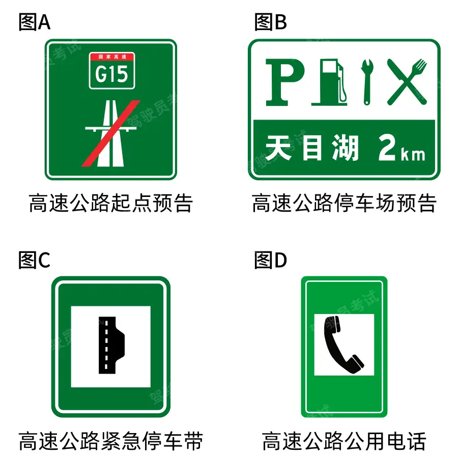 A、中心圈B、導(dǎo)流線C、網(wǎng)狀線D、停車區(qū) - 下列高速公路交通標(biāo)志與其含義對應(yīng)正確的一項(xiàng)是?