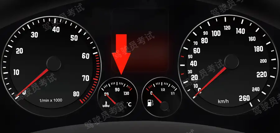 • 圖中箭頭指示的儀表是何含義?A、電流表B、水溫表C、燃油表D、壓力表