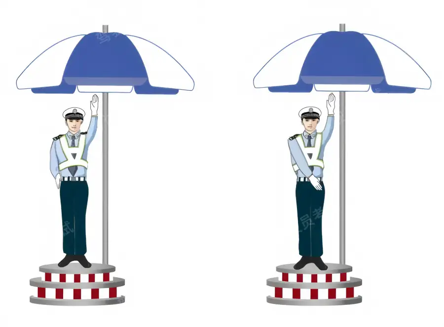 A、地點(diǎn)距離B、行駛路線C、行駛方向D、終點(diǎn)地名 - 圖中這組交警手勢(shì)是什么信號(hào)?